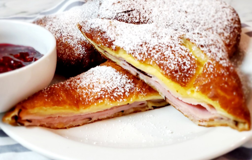 Separate your biscuits on a nonstick workstation. Press each biscuit flat using your hands. You want to create a rectangle-like shape that should be roughly 7×8 inches. If it is not exact, that’s OK. You can stretch the biscuits gently as you wrap them around the ham and cheese. On a separate workstation, start making your ham and Swiss squares. Take two slices of ham and fold in the corners to create a square shape. Top with 1 slice of Swiss, breaking off the corners and tucking them under as they will puncture holes in your biscuits. Repeat with remaining ham and cheese. Once all squares are formed, place one stack toward the bottom of one stretched biscuit. Fold the top of the biscuit over and press edges shut. Smooth down creases and set aside. Repeat with remaining biscuits. When you are done prepping your Monte Cristos, set them in your deep fryer, 2 at a time. Fry for 1 ½ – 2 minutes on each side. Remove from deep fryer and transfer to paper towels. Continue with remaining biscuits. Allow your Monte Cristos to cool about 3 minutes before dusting with powdered sugar. Serve with a little raspberry jam for that traditional taste.