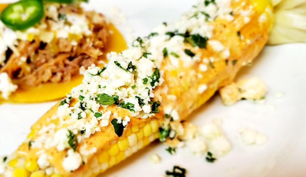 Once your corn is ready, carefully remove from the oven. It will be hot. Now, you can either allow it to cool for 30 minutes, or use a towel to peel the husks off the cobs. Spread about 1 1/2-2 tbs of the mayo mixture over the cob and top with a good sprinkle of the cheese and cilantro, That easy!