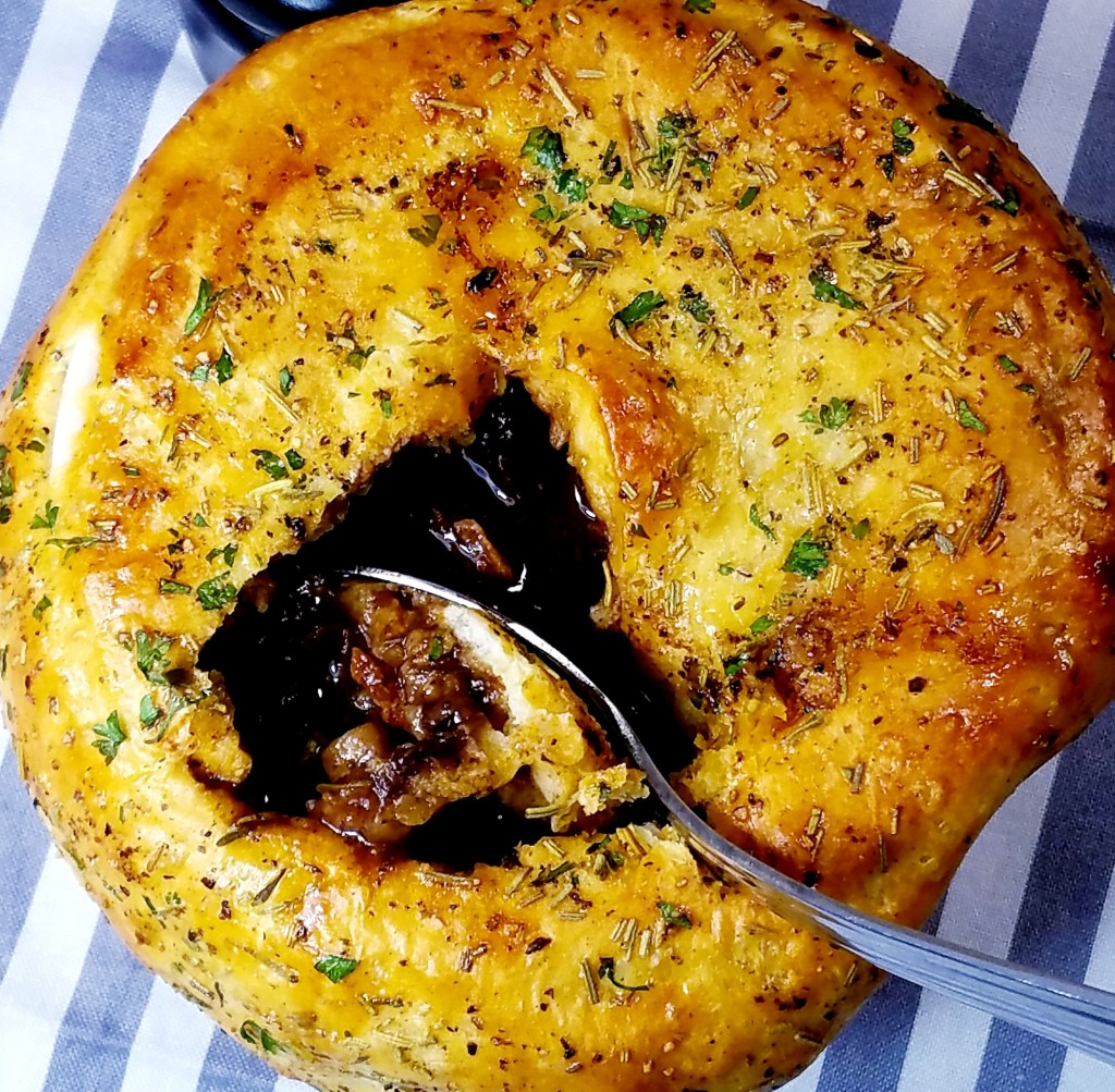 Begin making your pie crust by removing all biscuits and separate on a nonstick workstation. In a small bowl, combine rosemary, thyme and parsley. Mix well. Sprinkle with equal amounts over the top of each biscuit and gently press into the dough. Spoon burgundy over your mash leaving ¼ inch at the top of your ramekin. Cover each ramekin with 1 biscuit, gently pressing sides down over the edges. Make your egg wash by lightly beating 1 lg egg with 1 tsp water. Place all the ramekins on a baking sheet to prevent spilling over. Brush tops of your biscuits with the egg wash making sure to coat the edges as well and bake for 30 minutes or until crust is golden brown. You can serve this dish with an earthy red wine. I, personally, am extremely fond of California Cabs, but you can most definitely serve this dish with a good imported French wine.