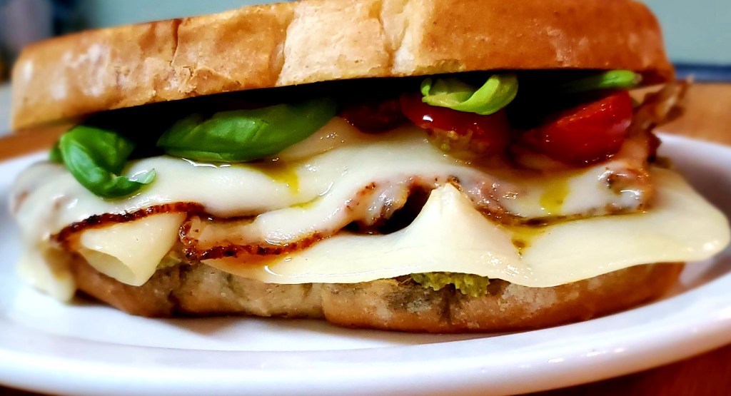 Now, it’s time to bring it together. Since this is not a traditional grilled cheese, were going to start off by toasting the bread on both sides. Heat a nonstick pan or flat top to medium high heat. Spray each slice of bread on one side with nonstick cooking spray. Lay them on your flat top, sprayed side down. Allow them to toast up for roughly 1 minute or until they start browning. Spray other sides and flip. Spread 1 tbs pesto on 4 slices of bread then, top with 1 slice of Swiss. Allow bottoms of the bread to toast and remove. Allow them to cool on a cooling rack.