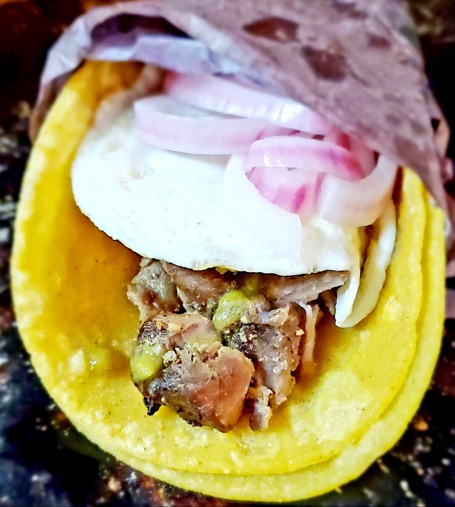 It’s time to put it all together. Using 2 tortillas per taco, top with about 1/2 c of pork, a drizzle of the anaheim sauce, 1 egg and a few onions. Repeat and eat. These are phenomenal!