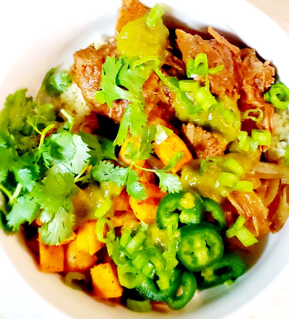 Get your bowls put together by adding about 1 c couscous to the bottom of each bowl. Top with 1/4 c meat, some caramelized onions, jalapenos, potatoes and cilantro. Sprinkle with green onions and poblano sauce and you’re ready to go. I honestly don’t cook with a lot of salt, I prefer natural flavors when it comes to stuff like this. If you like a lot of heat, salt, msg, or whatever your heart desires, by all means, add it and make it your own.