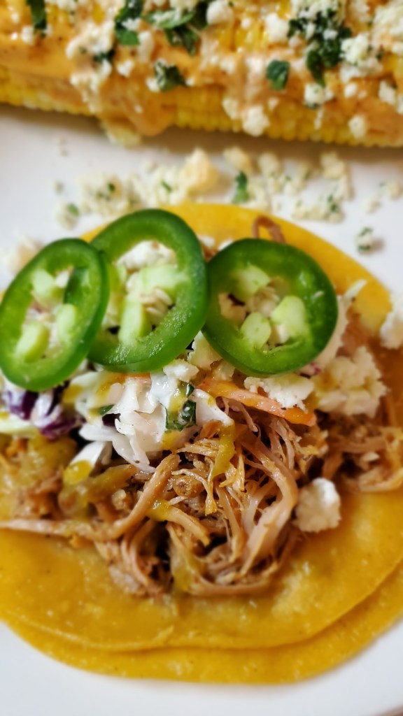 Now let’s put these together. Arrange the tortillas on each plate. Add about 1/2 c of the shredded pork to each taco. Sprinkle with queso and top with 1/4 c of slaw. Add a few slices of jalapenos and a squirt of that jalapeno sauce and vavoom! These are ridiculously good tacos.