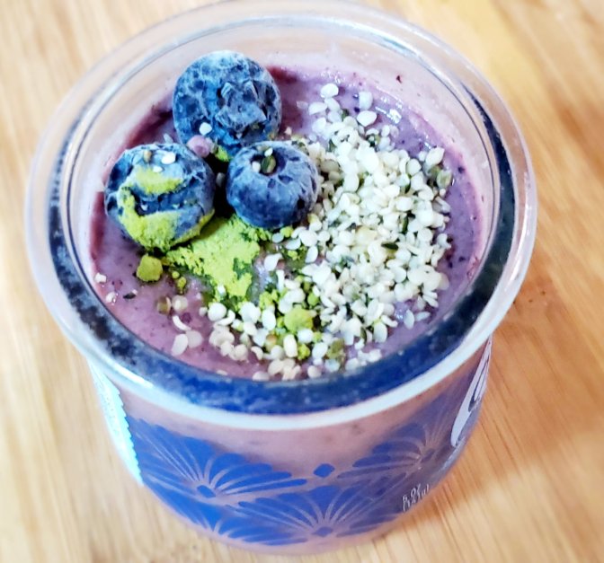 Add the first 3 ingredients to your blender or food processor. Blend until smooth. Transfer equal amounts to 2 small bowls or 5oz Oui yogurt cups. Add 2 tsp chia seeds to each cup and mix well. Cover with plastic wrap and refrigerate overnight. Garnish with a sprinkle of matcha powder, a few frozen blueberries and 1 tsp hemp seeds per cup.