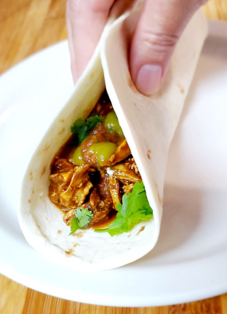 Now, let’s put this together. Heat your tortillas on your comal, flat top, in the microwave, or maybe you’re like my mother and heat them right on the stove top burners. Arrange the tortillas on plates and add about 1/2 c of the molé coated chicken. Sprinkle with a little queso fresco and some cilantro leaves. Spoon some salsa roja and jalapeno sauce over the top and you’re done! That easy. If you’re looking for a spicier salsa recipe, check out my jackfruit taco recipe in the tacos section of my site. It’s FANTASTICO!