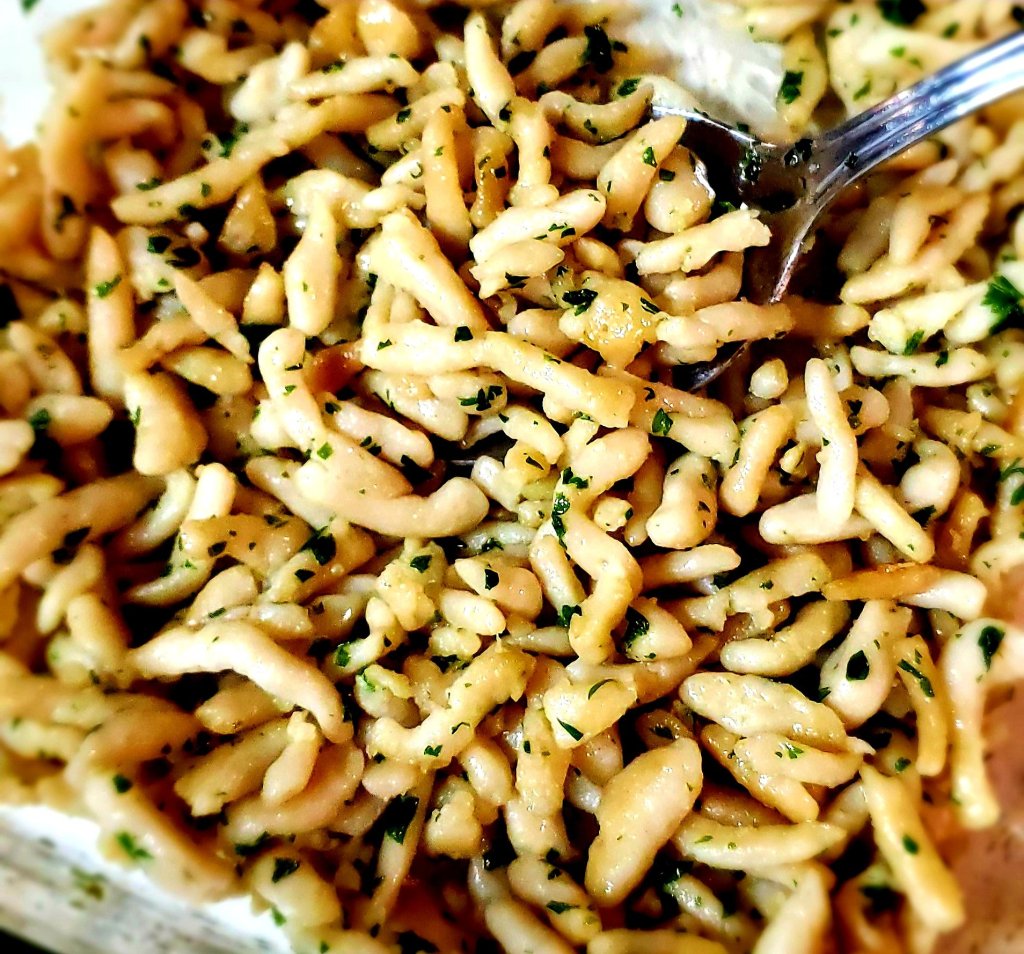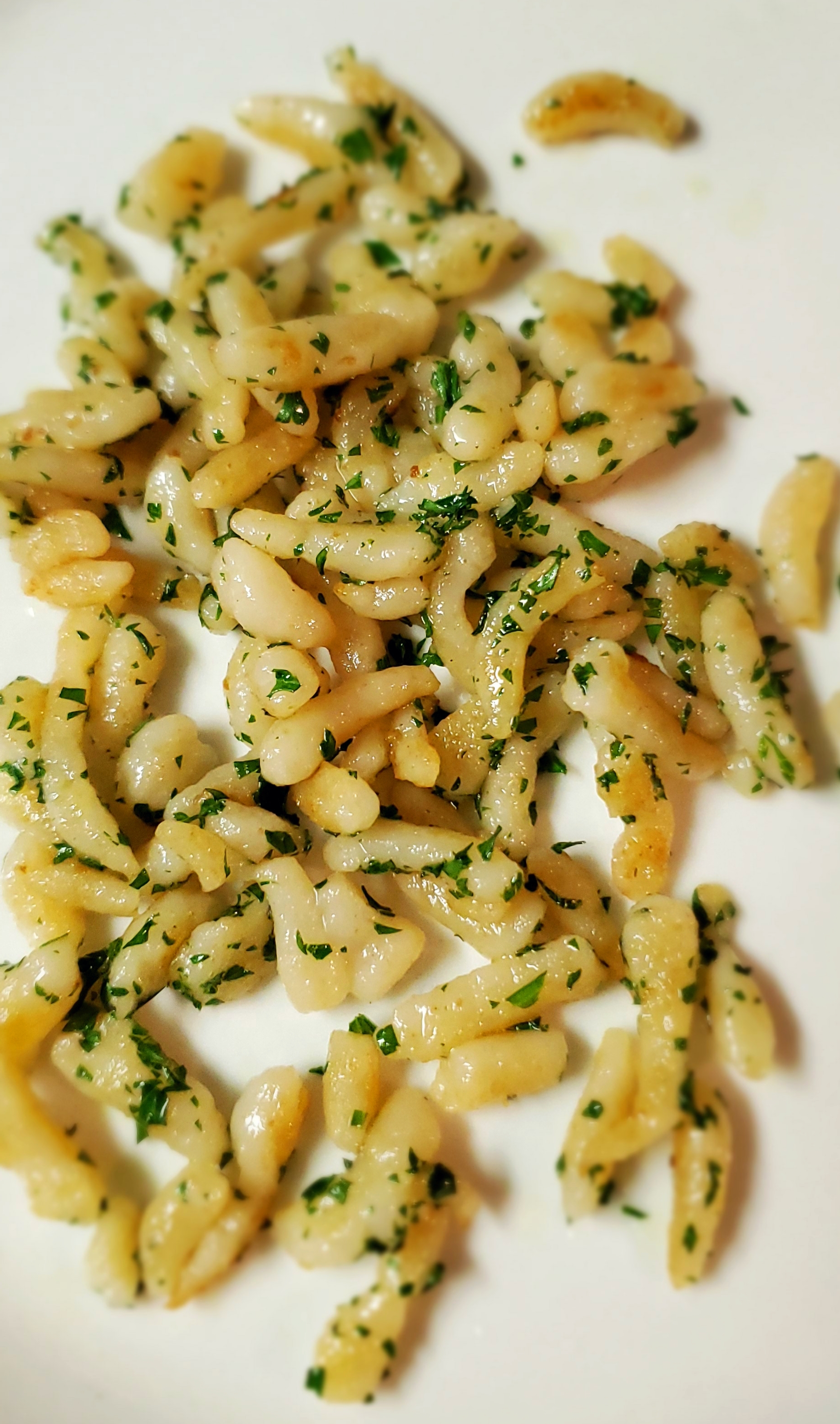 One of my favorite things to order when I lived in German country for a year and a half was spaetzle. There’s something about that subtle butteriness to balance out a hearty jägerschnitzel. Unfortunately, it’s often made by using a specific tool that allows loose batter to drip from small holes into a pot of boiling water. This recipe alleviates the need for the tool and/or the batter.