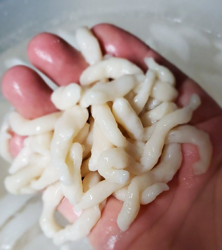 Remove biscuits from can and separate on a nonstick surface. Sprinkle flour on work surface. Take one biscuit and pinch off small ½” pieces. Roll pieces in flour and vigorously roll back and forth between your hands to make a thin, oddly-shaped noodle. Set aside and dust with a little flour.
