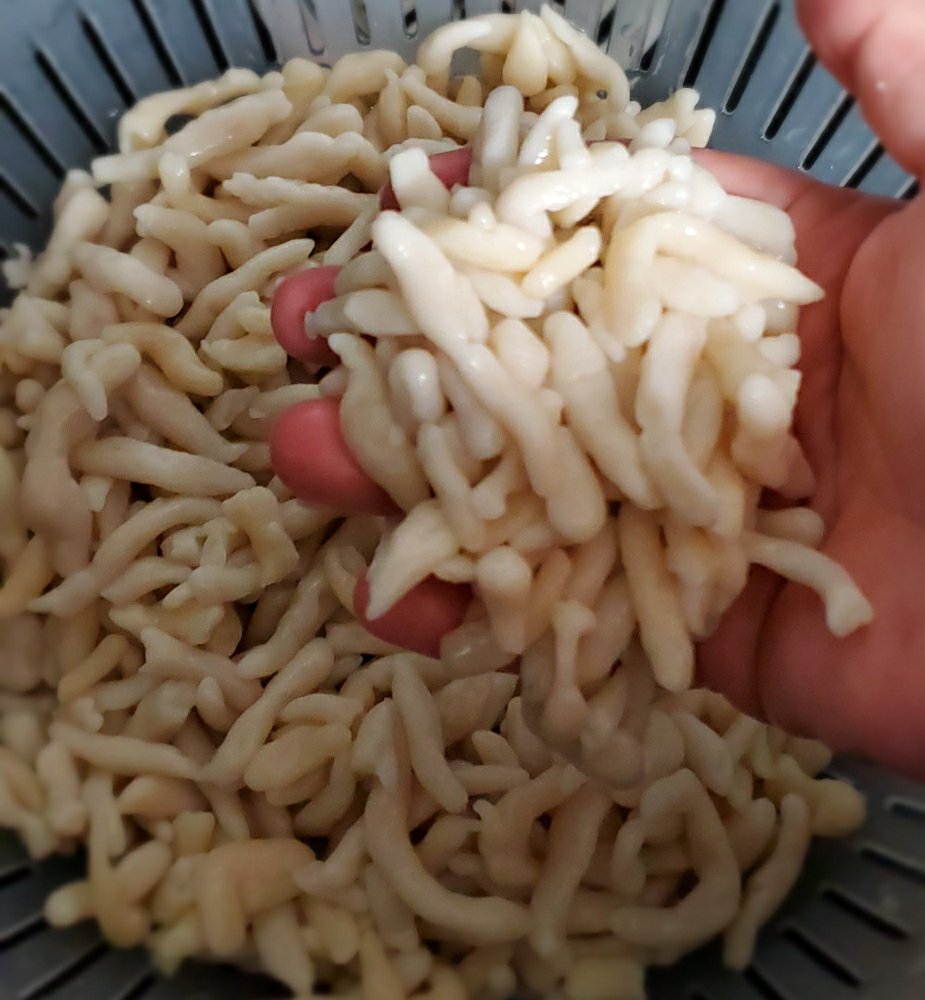 Pour out the old water from the pot and ice bath and refill with fresh water and ice. Repeat process with the remaining spaetzle.