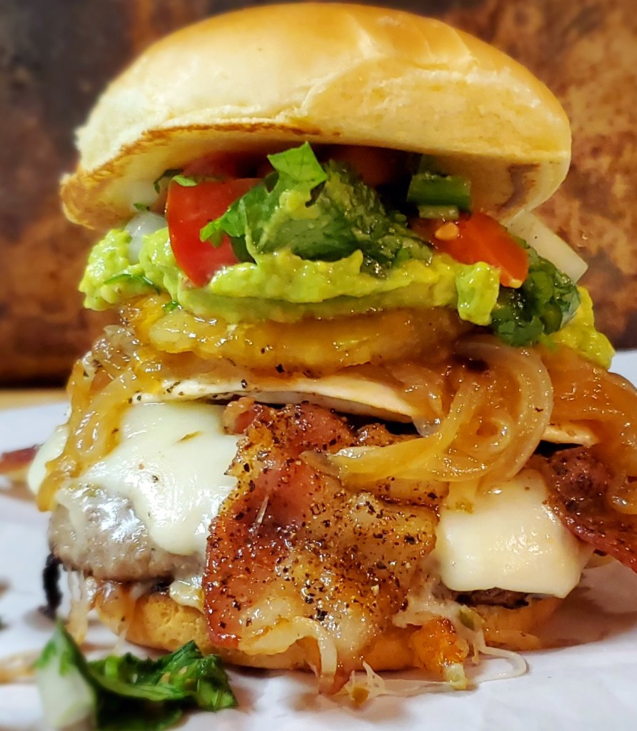 Now we can assemble. Open your buns and start off by layering with the patties, 2 slices of bacon each, 1 egg each, about 2 tbs of onions, 1 pineapple ring, avocado and finish it off with pico and the top bun. There you go, my Cozumel burger.