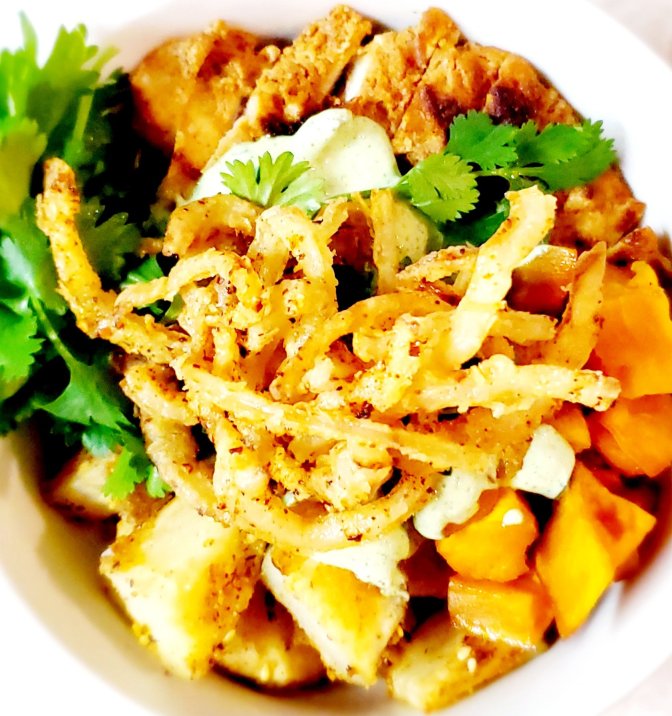 It took me a good while to figure out what would compliment this chicken but, I think I hit the nail on the head with this dish. I’ve put together a fabulous bowl of spicy Ethiopian chicken, brown sugar sweet potatoes, African spice dukkah white potatoes, coconut and sweet pea couscous (one of my faves), spicy shichimi dusted onion strings and finish it off with easy-creamy cilantro sauce. It all works so well together, you won’t believe it until you try it.
