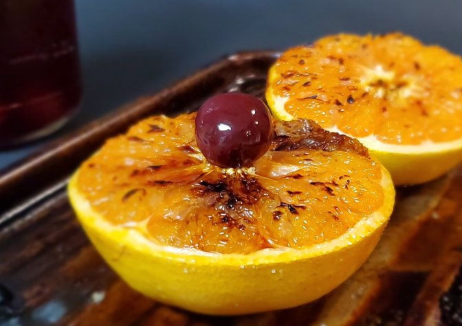 Time for the grapefruit. Preheat your broiler. Make sure the rack is on the top level. Sprinkle the cut sides of each grapefruit with 1 tbs of sugar, each. Arrange on a sheet pan and slide under the broiler for 10-15 minutes. Now, I have an old 70’s double oven so, cooking times will very. Once the grapefruit has caramelized a bit and the pulp is starting to push out of the skin, remove from the broiler and allow to cool 5 minutes or so. Top each grapefruit off with one of those delicious little cherries and there you go.
