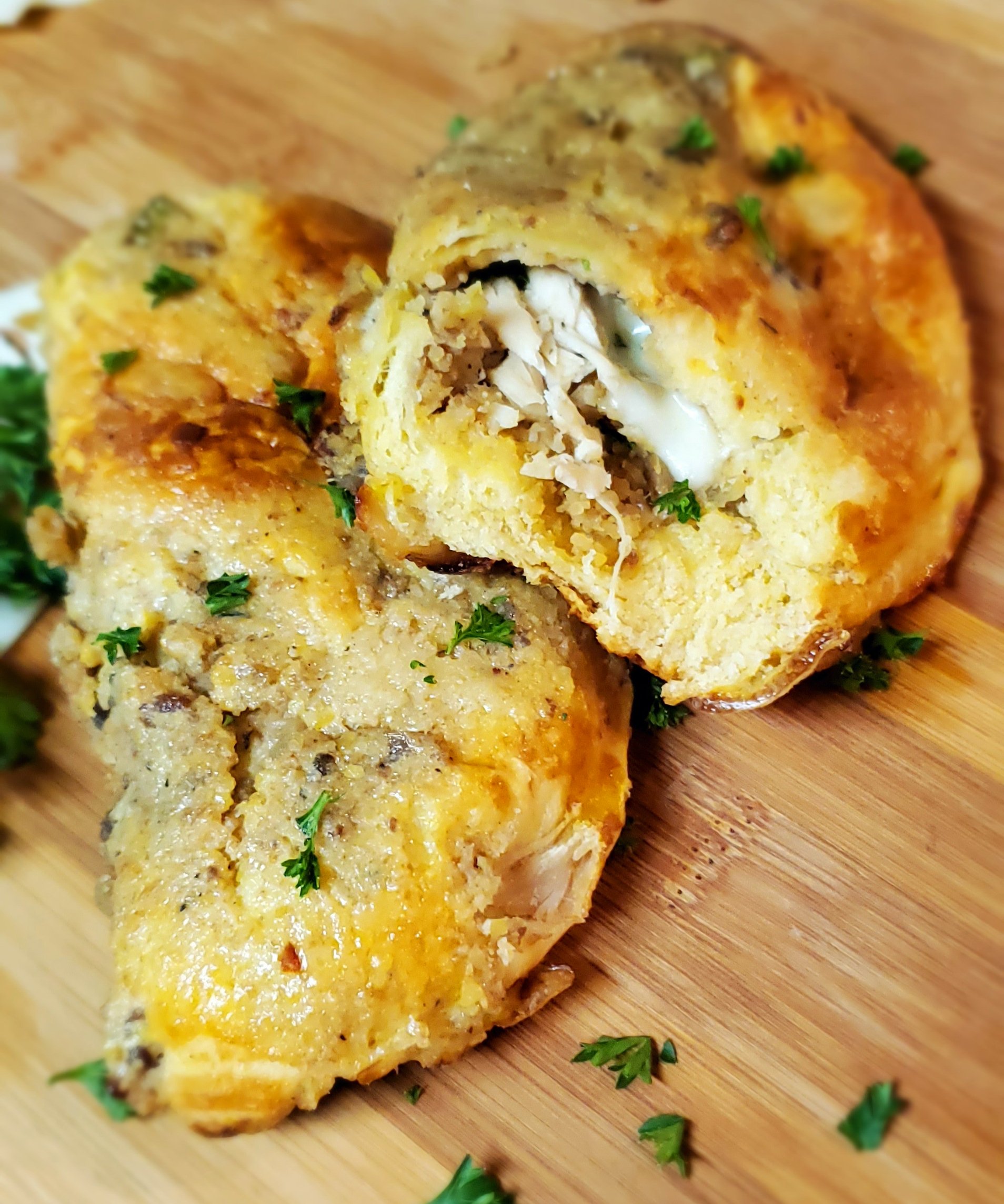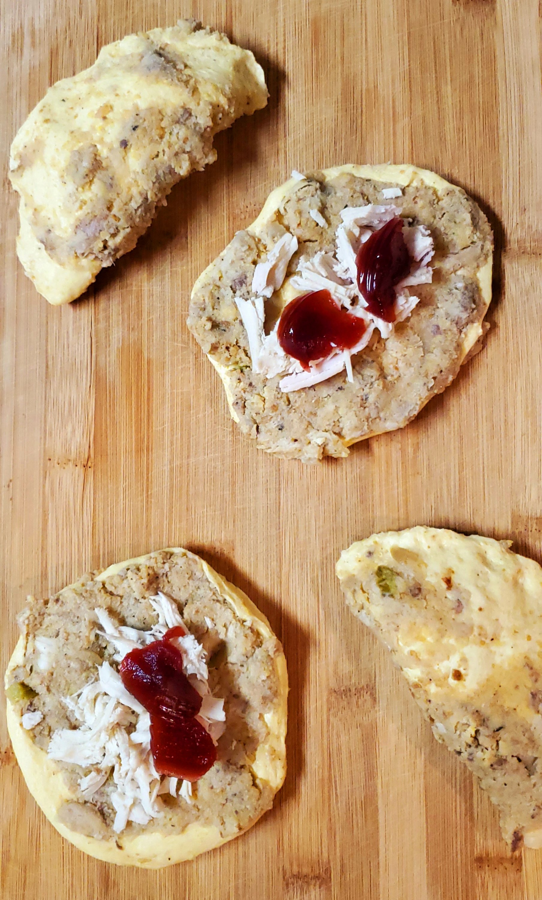 Heat stuffing and turkey just enough to warm through. Set aside. Separate all your biscuits on a nonstick workstation. Press each biscuit as flat as you can using your hands to create a 6-7 inch disk. Set on workstation and sprinkle with stuffing, pressing the stuffing into the biscuit. Turn over and repeat. Place one slice of cheese in the center of each biscuit and top with some turkey and about 1-2 tsp cranberry sauce. To add a bit of color, you can sprinkle a little parsley over your filling. Fold one side over, pressing edges together. Arrange on a nonstick sheet pan and bake for 30-40 minutes or until your packets begin to brown. Serve with gravy for dipping or even add some fries to your filling and say, “Sayonara”, to your leftovers.