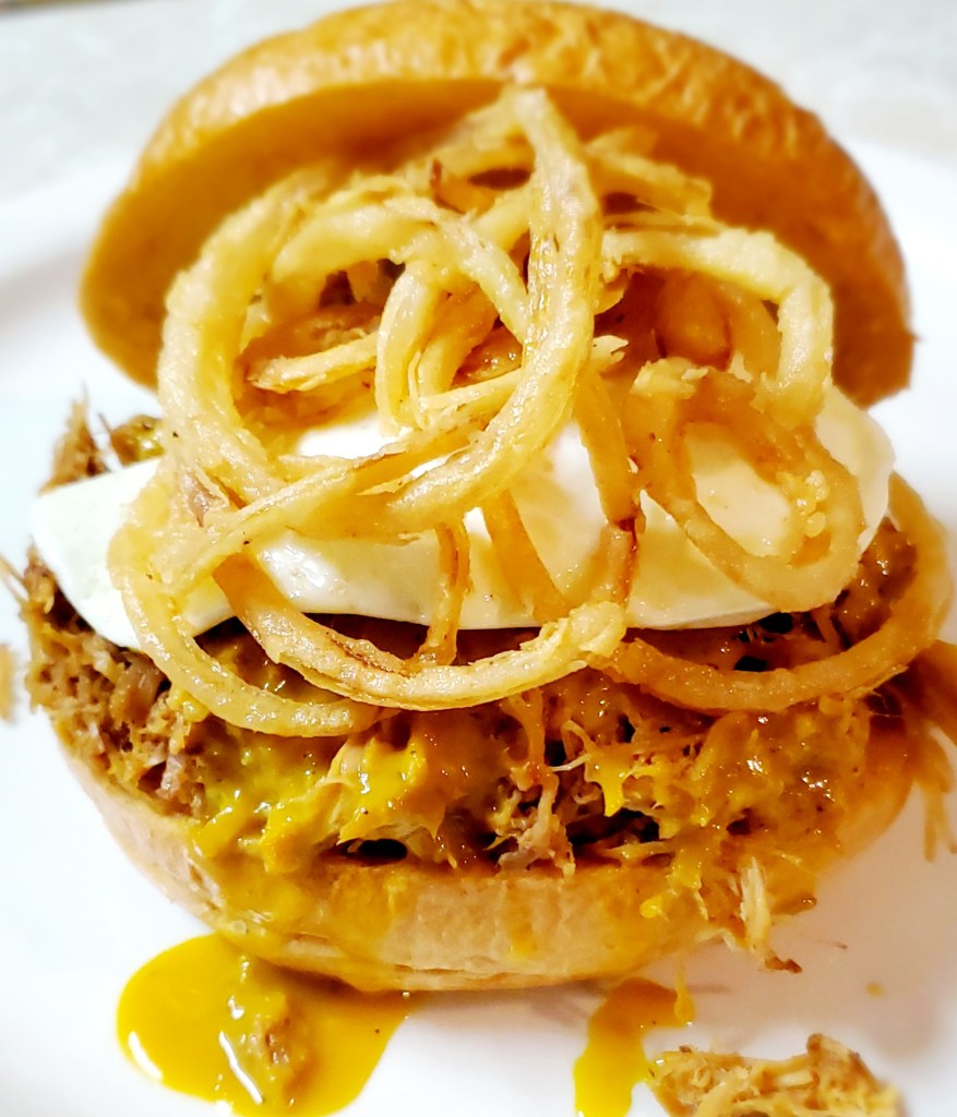 Now, let’s put everything together. Heat some of the BBQ sauce over medium low heat, stirring often. Just bring it a bit beyond room temperature. Shred the pork using two forks. Top each bottom bun with about 1½ c of shredded pork. Pour some of your Carolina sauce over the meat. Top each sandwich off with 1 fried egg and a few onion strings. Finish off with the top bun and you’re done.