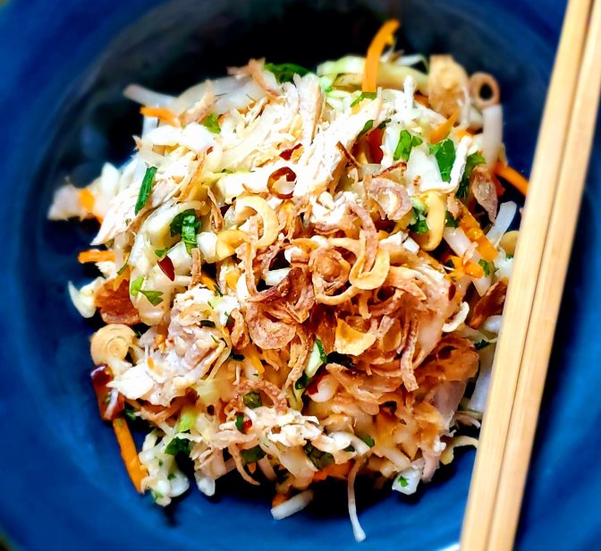 Start this baby off by boiling the breast in water until done. I don’t season the water at all. Once cooked through, transfer the breast to a bowl and allow to cool. While the chicken is cooling, make the dressing for your salad. Combine the fish sauce, vinegar, oil, lime juice, sugar and garlic in a deep bowl. Mix well until sugar has dissolved. Add slaw mix, onion and Thai chilis. If your chicken has cooled, shred with two forks and add to mix. Add the cilantro, crushed red pepper, 5 spice and peanuts. Toss everything together until well combined. Divide evenly between 3-4 plates and sprinkle with crispy shallots. I usually make my own but, I bought a giant economy size container at the Asian market. They ended up being a great addition to a great salad. Enjoy!