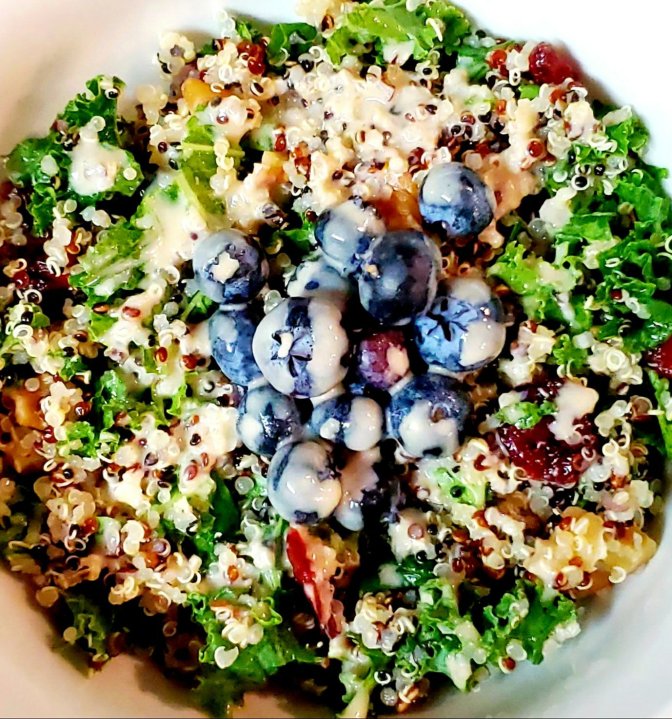 Transfer the quinoa, cranberries and walnuts to a bowl. Rinse your kale leave. Remove the thick center stem. Tear the leaves into small pieces. Transfer to the quinoa bowl. Toss the salad well. Equally plate up the salad and top each with 1 tbs fresh blueberries. Drizzle with the honey tahini and there you have it.