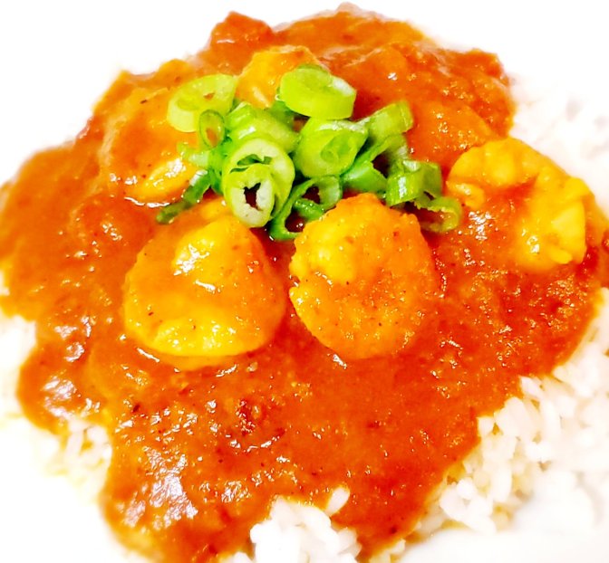 Now, it’s time to thicken your creole. Make your roux by heating a small pan over medium high heat. Add ½ c flour. Whisk it around a bit until the flour begins to brown slightly. Next, add 2 tbs oil. Your roux should look like raw cookie dough. Use a ladle to gradually whisk 1 ½ c of the creole liquid into your roux . Now, gradually whisk the roux into the pot of creole. Add your shrimp to the pot and make any adjustments with the salt and pepper as needed. Cook additional 10 minutes. Serve over rice with a little green onions.