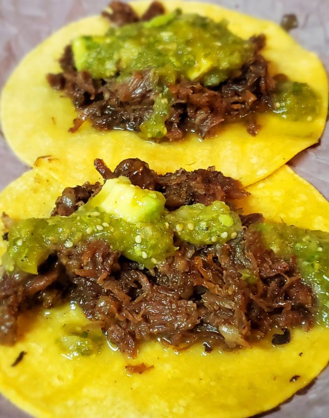 Add about 1/4 c barbacoa to each tortilla and serve with salsa.