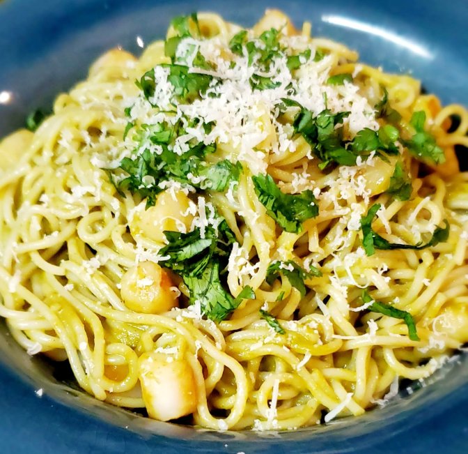 Once the scallops are cooked, remove from pan and set aside. Add the angel hair to the scallop pan. Bring the pasta back to temp over medium heat. Add the sauce and give it a few tosses to combine well. Mix in the scallops and serve with a little chopped cilantro and freshly grated parmesan.
