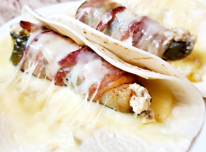 Slightly heat tortillas in the microwave for about 15 seconds. Put 1 slice of provolone in the center of each tortilla, followed by 1 stuffed and wrapped jalapeño. Fold tortilla over and heat in microwave for additional 30 seconds, heating 2 tacos at a time. An awesome grab-n-go food for any college student.