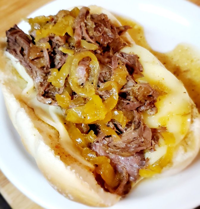 Add the roast and remaining ingredients to your crockpot. Set for 8 hours. I like to flip the roast half way through the cooking process, but it’s not necessary. Once the roast is done, use a fork to shred. Open your rolls and place 3 slices of provolone in each. Fill each with ¾-1 c of beef and peppers. Spoon some liquid over the beef and serve hot.
