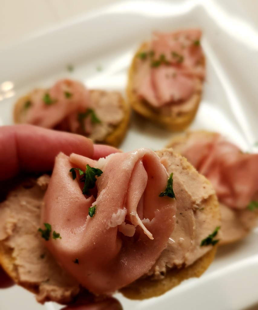 Assemble your crostini on your serving plate or prep area. Spread the mousse over each crostini. Tear each slice of Mortadella in half and swirl around on top of the mousse creating a rose effect (semi-sloppy rose effect). Sprinkle a bit of parsley over each crostini, just enough to give them a little color. Drizzle just a bit of truffle oil over the top of each crostini, or you can drizzle over half to give guests a choice of with or w/o truffle oil. And voila! Your appetizers are ready to go.