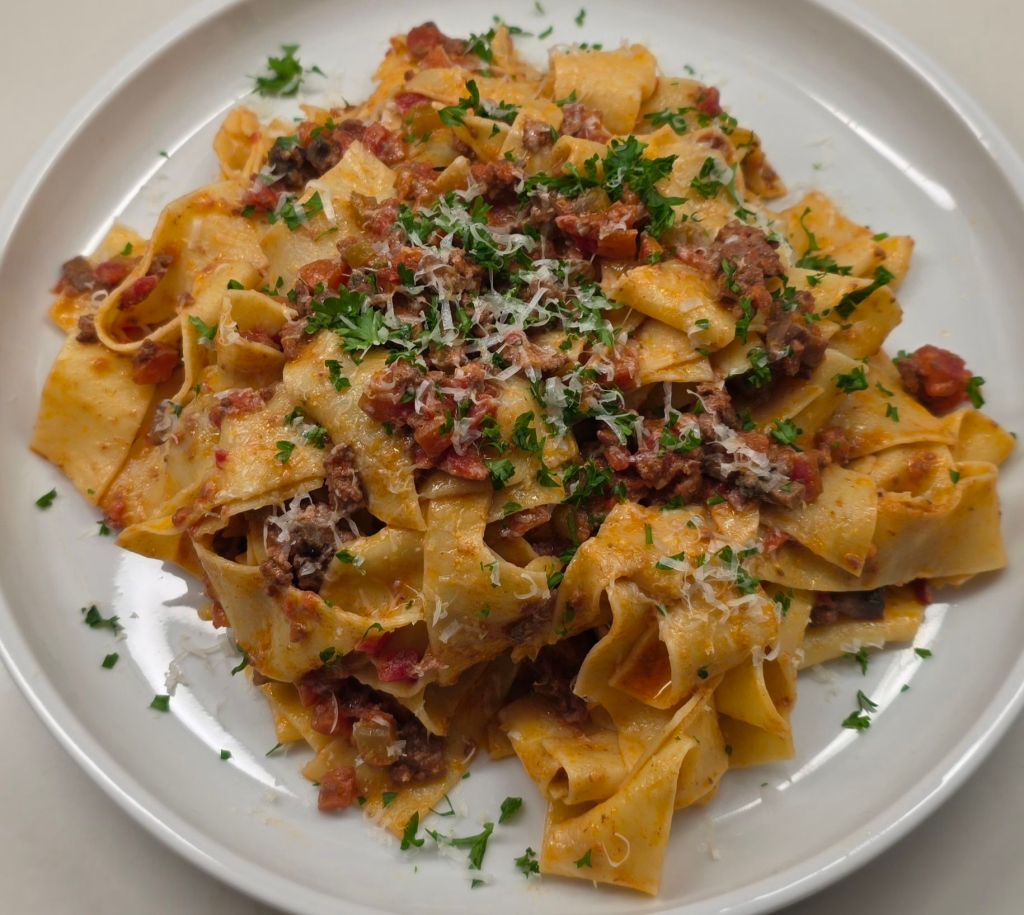 And finally, the pappardelle. Why am I using dried pasta instead of making my own you ask? Because….my pasta maker intimidates me. Since I bought it, I have only used it once and though the pasta came out ok, I was not impressed. I feel I need to master the little sucker before I start posting recipes using homemade pasta. Many a night I walk into my pantry and look over at the bags of simolina flour that mockingly stare back. “Some day my friends, some day. ” I whisper. But not today. Today it will be dried pappardelle with a traditional bolognese enhanced by lots of red wine, mushrooms and parsley. Enjoy!