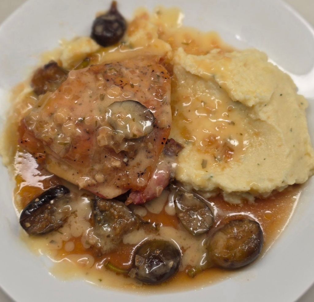 As you may know, most of my sauces are made with wine, beit white or red, and usually fall within the lines of being a Chardonnay or Cab, (classic base wines). I try to keep it simple in regards to a wine sauce, so my experience with sherry is not that vast. Yes, I’ve used it here and there, but the bottle usually just sits on the shelf of my pantry with the rest of my liquid ingredients. Although lately, my mind has been scrambling, scouring proteins, vegetables and fruits that could be enhanced by a good dry sherry, something I havent done yet. I wasn’t quite sure it would work, pairing a sherry sauce with chicken and figs, then serving it alongside saffron scented parsnip puré, regardless of the fact that I had been wanting to make chicken and figs for several months. I just couldn’t get that funky tasting idea out of my head. Chicken and sherry and saffron and parsnips….hmmm. The figs and sherry, no problem. Sherry has such sweet undertones it would be no problem, but paired with the chicken and saffron and parsnips. Blah! I finally decided to do some research. I was sitting in my car at work, pondering this idea with extreme diligence. Figs, I thought. Figs are an aphrodisiac, they have deep roots in both Greek and Middle Eastern cuisine, as well as saffron. So, that took care of that. Then the chicken. Although both of those regions traditionally serve lamb as a first choice protein, chicken is a good alternative in both regions and works well with fruits like figs. Then, we have the sherry. Although sherry is not a common staple in Greece or the Middle East, it plays a huge roll in many Spanish dishes. Still…I was a bit apprehensive about this particular wine. It just has such a unique flavor, I wasn’t sure it would mesh well. I am so used to writing menus purely by ideas. I’ve written winning menus with recipes I had never even tested. They were successes because I thought, this would be good with that and that would be good with this. But again, the sherry was not hitting me right. Then I remembered the first time I learned how to make a beurre blanc. I was a line cook at Hotel Icon and had to jump on sauté for the sauté cook while he took off to take care of personal business. That butter sauce was absolutely amazing. My tastebuds melted under the creamy texture of the white wine reduction. It was so silky with a hint of tartness from the lemon and mild anise flavor of the tarragon. Thats when it hit me, a sherry based beurre blanc. Thankfully there is nothing like this that was found during any searches, (I have a gnawing feeling that I’m going to see this beurre blanc recipe in a lot of places after I post this) so it was going to be a definite as far as the chicken and figs and sherry and maybe even the saffron, but still, the saffron scented parsnip puré. Ok, so let me explain something, almost 100% of the time, when you go to a restaurant and see descriptions like this, it’s a simple play on words to make something sound more enticing, more appealing, cooler. So,we all know I can’t really scent the parsnips, so what I do with this dish is add just enough saffron to get the slightest hint within my puré. The parsnip puré recipe is actually one I made up several years ago that got me a job as an executive sous chef cooking for very VERY high profile people. Of course I never met any of them or saw them, I just made their food and it got hauled to the airport and put on private jets. It was pretty cool, but nothing like the restaurants I was used to working in. In all of the other restaurants, I was able to watch the plates come back and head for the dish pit. If the plate was empty, they loved my food, which was the whole reason I was working in the hospitality industry and slaving the way I did for meager pay. I remember one line cook asking me, “Why do you always watch the plates when they come down?” He meant into the belly of the basement where the restaurant kitchen was. I raised my brow to him. ” Because I want to know if they liked my food.” His response was,”Hmh. I never thought about that before..” Honesty, what’s the point, then? If youre not going to bring it in the kitchen and create culinary masterpieces like priceless works of art that can make a persons tastebuds sing, why even be there? But anyways, I had 1 hour to make 3 complete dishes for this stage or “stahj” (essentially, the cooking interview for someone who will be cooking within a business kitchen; ie: line cook, any type of station chef, sous chef, executive sous and executive chef). I remember one of the dishes I decided to make was pan seared duck breast, another was lobster medallions and the saffron scented parsnip puré was in there somewhere along with the other main and two other sides. Anyway, all of the shareholders, managers, owner and chef loved it and offered me the position so rock on, it was good and interesting. So, I chose the parsnips for this particular dish because the sherry offers that nutty sweetness and parsnips also carry a slight sweetness, why not put them together instead of the traditional mash that so many other people use for chicken and figs? Then we have the combination of chicken and beef broth. This is something I personally like to do. In my opinion, it creates a slight pork flavor which is exactly what I want in this dish. I think it will compliment the sherry and figs well. Lastly, we have the 2 method cooking process. Being that I’m cooking bone in chicken with skin, there will be a lot of fat. Most people feel that an excessive amount of fat in a dish is disgusting. This method helps eliminate that problem. Roast the thighs off in a roasting pan, transfer to a braiser. Cook for 45 minutes and add figs, cook additional 30 minutes, no excessive fat. You can’t really dry out thighs (you have to try really hard to do that) and you make the beurre blanc separately. Everything came out unexpectedly amazing and the sauces